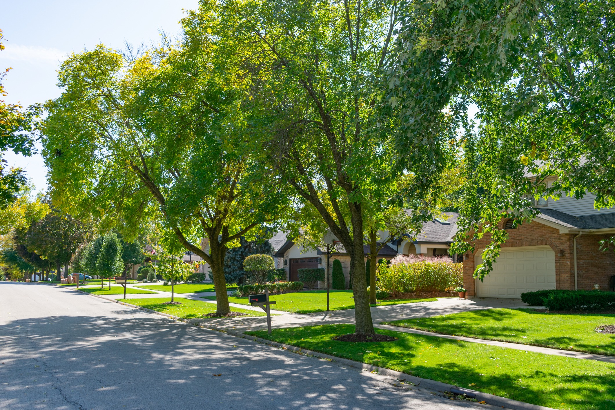 A person trims tree branches using a cherry picker near First Baptist Church building. Another person stands by, surrounded by greenery under a blue sky.